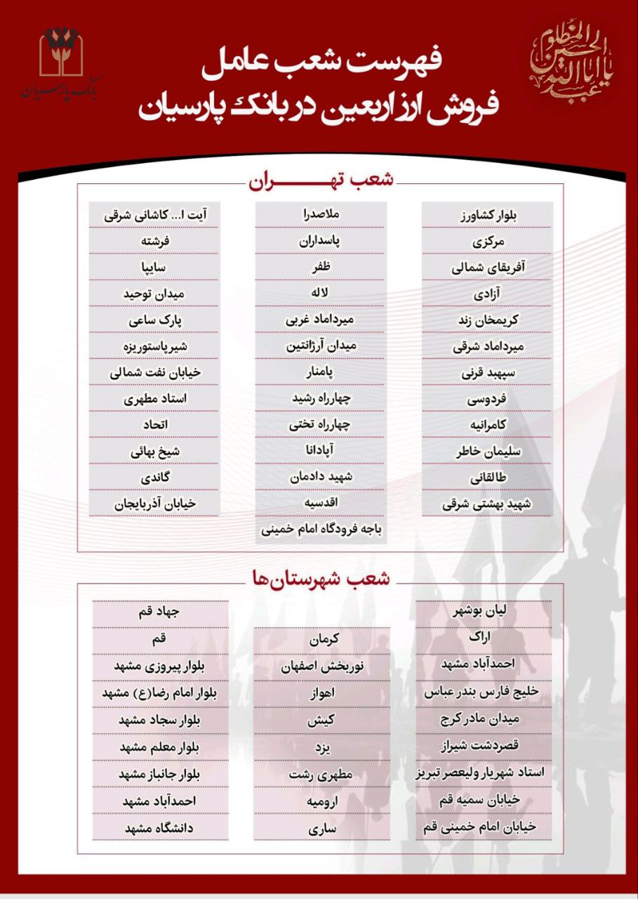 شعب منتخب عرضه ارز اربعین بانک پارسیان