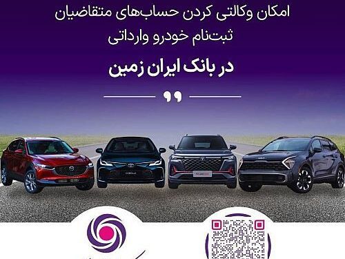 آمادگی بانک ایران زمین برای معرفی حساب وکالتی جهت خرید خودروهای وارداتی