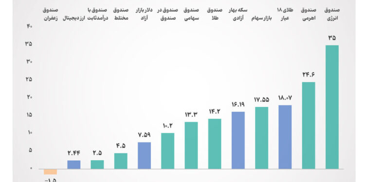 طبق اطلاعات مرکز نظارت بر صندوقهای سرمایهگذاری سازمان بورس و اوراق بهادار، بازده ماهانه صندوقهای سرمایهگذاری در اوراق بهادار مبتنی بر کالا (طلا)، صندوقهای سهامی، صندوق در صندوقها، صندوقهای مختلط و صندوقهای سرمایهگذاری در اوراق بهادار با درآمد ثابت به ترتیب مثبت «۱۴.۲»، «۱۳.۳»، «۱۰.۲»، «۴.۵» و «۲.۵» درصد بوده است.