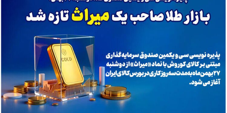 تومان نیوز:پذیره نویسی سیویکمین صندوق سرمایهگذاری طلا با نماد «میراث» از دوشنبه ۲۷ بهمن ۱۴۰۴ به مدت ۳ روز کاری در بورس کالای ایران آغاز میشود.