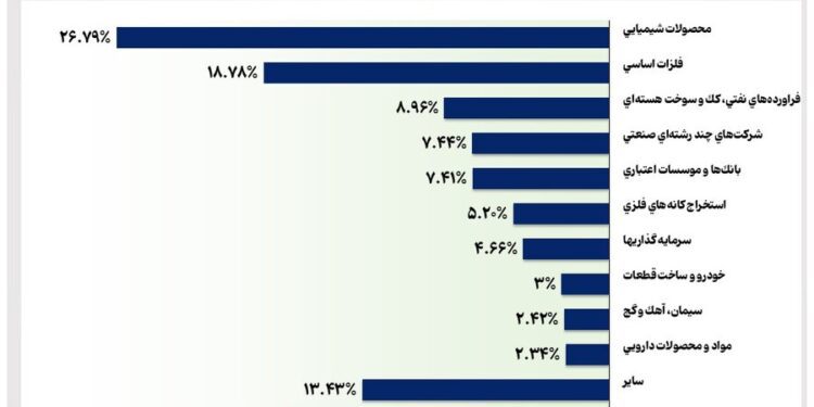 دادههای آماری مرکز پژوهش، توسعه و مطالعات اسلامی سازمان بورس و اوراق بهادار، نشان میدهد: از میان صنایع فعال در بازار سرمایه، صنعت محصولات شیمیایی با در اختیار گرفتن ۲۶.۷۹ درصد از سهم کل بازار و ارزش بازاری معادل ۴۲,۴۷۷,۸۵۳ میلیارد ریال، بیشترین ارزش بازار سهام را در میان صنایع فعال بورس تهران و فرابورس، در دی امسال به خود اختصاص داد.